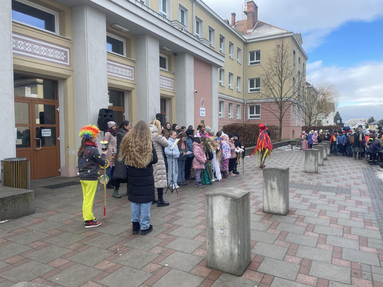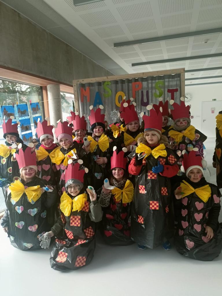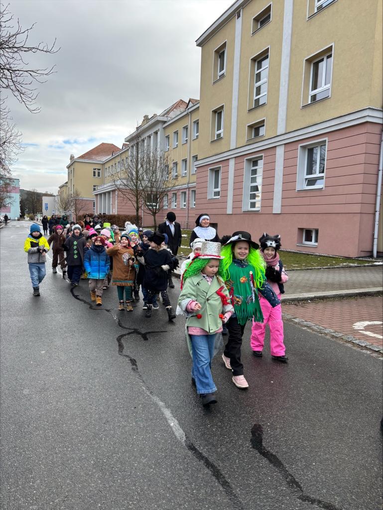 Ve třídách si žáci 1.- 4. ročníku připomněli tento dávný zvyk, představili si tradiční masky a pokrmy. V deset hodin se děti a učitelé sešli před budovou školy, kde laufr převzal z rukou paní místostarostky klíč od města a tím všichni získali povolení zúčastnit se masopustního průvodu. Veselá cesta městem proběhla za zpěvu písní a mnozí diváci byli překvapeni spoustou povedených masek, které byly na závěr odměněny perníky ve tvaru zvířátek.![]()