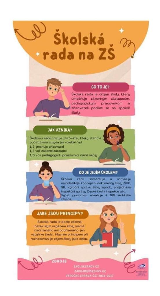 rádi bychom vás informovali, že v rámci čtvrtečních třídních schůzek budou ve škole přítomni i zástupci školské rady pro vaše případné podněty. Najdete je od 18 hodin ve vestibulu školy.